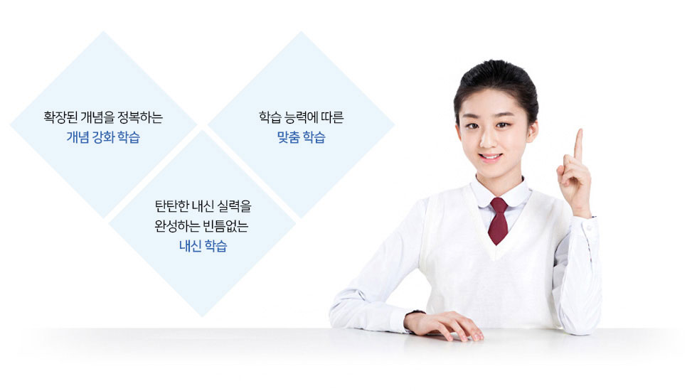개념 강화 학습, 4단계 내신 성공전략, 1:1 개별 맞춤 시스템