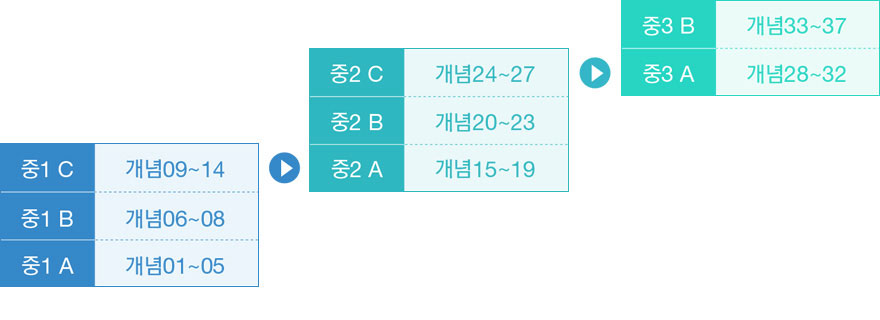 중등에서 고등수학으로 이어지는 중등 수학 37가지 핵심 개념을 학생의 능력에 따른 맞춤 학습과 밀착 관리를 통해 개념 단계별로 학습하고 인증합니다.